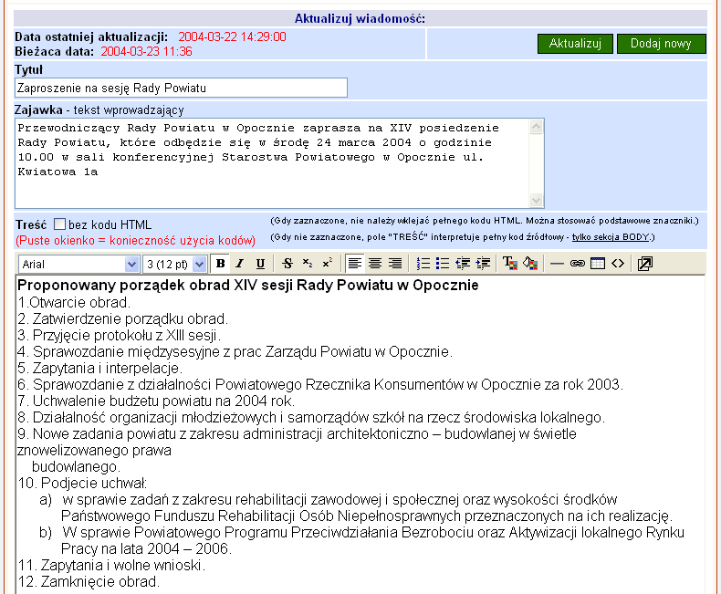 wyświetlania zawartości pola "Treść" w oknie